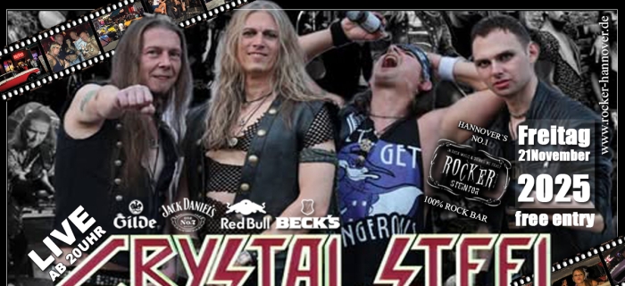 Freitag 21.November 2025 ROCKER Live: ab 20 Uhr CRYSTAL-STEEL!!! (80 s) Hardrock from Hanover!